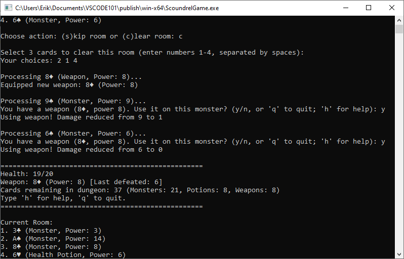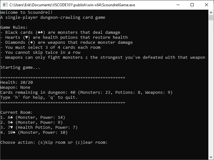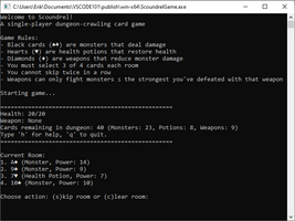 When I first learned about Scoundrel, a fun solitaire game that can be played with a standard deck of playing cards, I had just finished learning C#. I thought, "Hey, that seems simple enough, I bet I could probably virtualize that." I was right and wrong. It was simple, but for a new programmer, there was a lot for me to learn throughout the process. On a grand scale, game development was probably a relatively easy task, and because of that, I was able to get into it and complete the project.